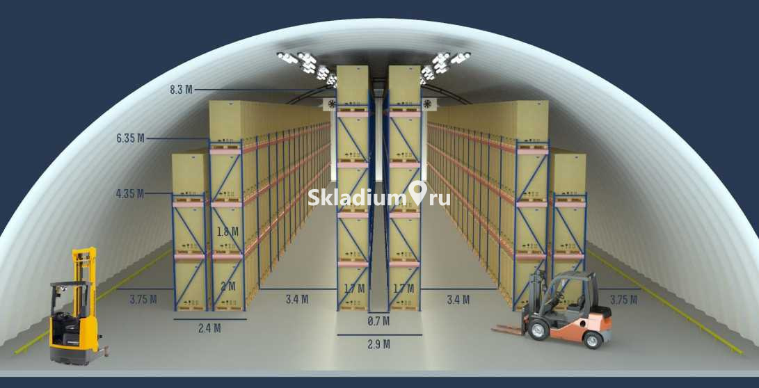 Высота потолков 8-10 метров Температурный режим от -18°С до +5°С Беcпылевые полы Неотапливамый крытый пандус Размер ворот м2 450 х 2 890 Съезд с пандуса для погрузки машин малой грузоподъемности, Морозильный склад (от -16 до -22)